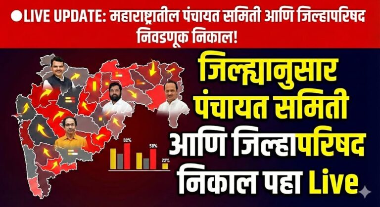मित्रांनो, जिल्हा परिषद आणि पंचायत समिती निवडणूक निकाल 2026 मध्ये राज्यभरात चुरशीच्या लढती, सत्ता बदलाचे संकेत आणि काही ठिकाणी जुने वर्चस्व कायम असल्याचे चित्र दिसून आले आहे. अंतिम जागावाटप स्पष्ट झाल्यानंतर जिल्हानिहाय सत्तासमीकरण ठरणार आहे.